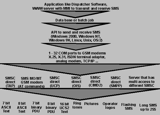 There are different ways to send or to receive a SMS. The simplest with a GSM modem. Unfortunately, a GSM-Modem can process only 6 to 10 SMS per minute. To increase the speed a connect to a communication server with up to 32 GSM modem is neccesary. Then becomes possible with it up to 320 SMS per minute. With this kind of SMS communication none direct connect to SMSC is necessary. Some GSM operators offer no direct connect. Consequently, the communication server with 32 GSM modem is a good alternative.